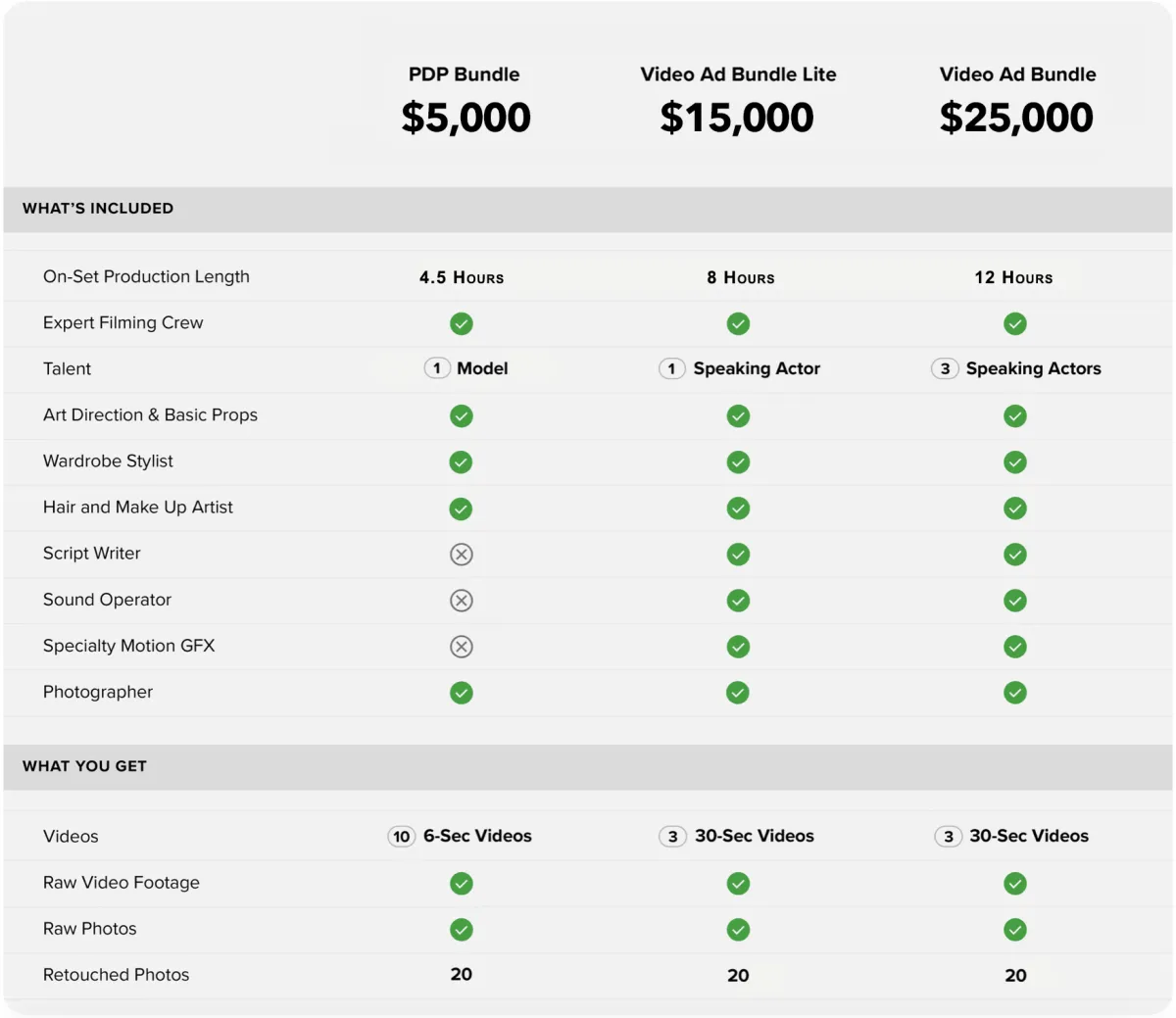 Our Product Detail Page (PDP) Bundle is designed to provide you with a library of digital assets that includes 250 raw photos, 20 retouched photos, and 10 custom video clips. This package includes attention-grabbing visuals that compel customers to click that "Buy Now" button.